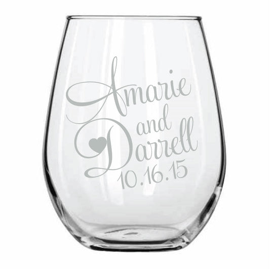 Personalized Stemless wine glasses, monogram design, personalized wedding favors with your names and wedding date