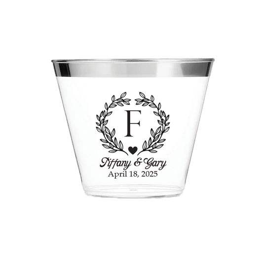 Personalized Elegant Monogram 9oz Gold or Silver Rimmed Clear Plastic Cups