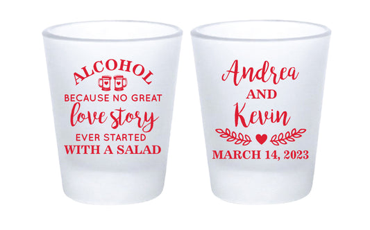 Funny wedding shot glasses - Alcohol because no great love story ever started with a salad