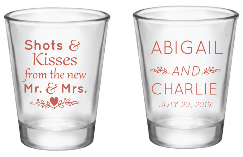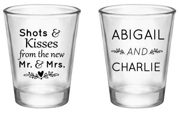 Vasos de chupito de vidrio personalizados de 1,75 oz. con un diseño "Shots & Kisses From The New Mr. & Mrs." para regalos de boda. ¡Personalícelos con sus nombres y la fecha de la boda!