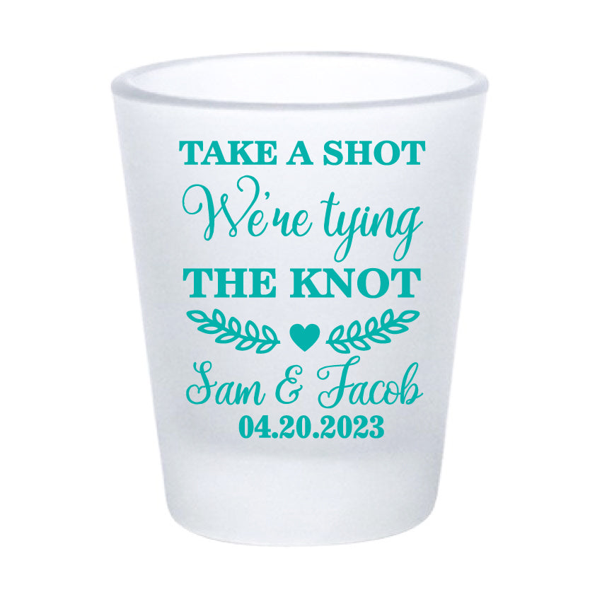 Product: 1.75oz GLASS shot glasses. Personalized just for you, with your names and wedding date.